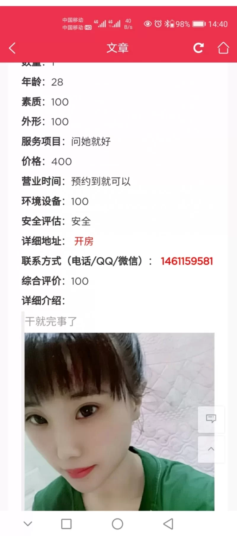 信息分类:骗子曝光 地区:山西省-吕梁 信息来源:线下 年龄:26 颜值身材:50 服务项目:50 价格:400 环境设备:不好 详细地址: (管理提示:经用户举报,此信息有诈骗行为,请勿被骗!) 联系方式(QQ号): (管理提示:经用户举报,此信息有诈骗行为,请勿被骗!) 详细介绍: 假的 骗子曝光