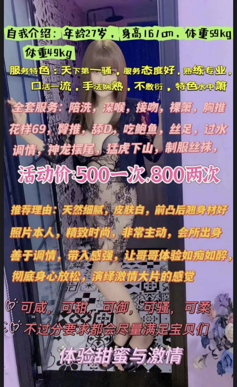 威客管理提示:要求付定金 保证金的,总之提前要钱的都是骗子 心情不太好,于是想着找点刺激。上高红灯区蛮多的,好看的也不少。家住附近看了一下,两家是一起的,有两个妹子做。有个高挑一点的比较好看,另外一个也还好,我跟她做的。第一次比较羞涩,主要看见长得还不错就日了。有点催吧,她说这片都是只做快餐100一炮做到射。只能戴套,还不给亲,摸了几下奶子比较小。隔壁那个真心美女,下次找她做。总之对于第一次做的人来说蛮爽的,小姐比较警惕,应该还算正规